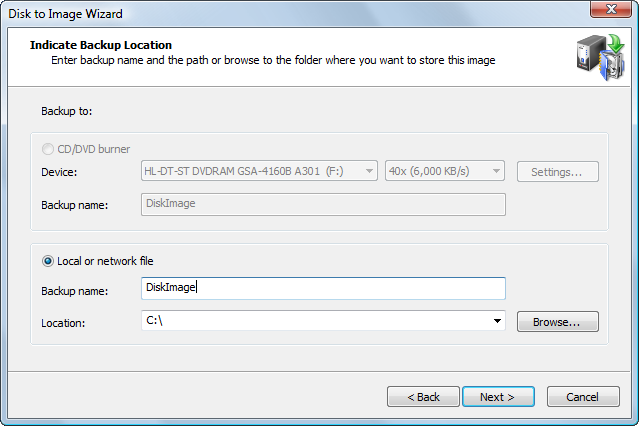 If you choose burning to CD/DVD, you need to select a burning device and enter a backup name. If you decide to store a disk image to a file, you need to provide a backup name and location. By default a folder named \Backups on a disk other than from which you are making a backup from and has the most of free space is suggested.